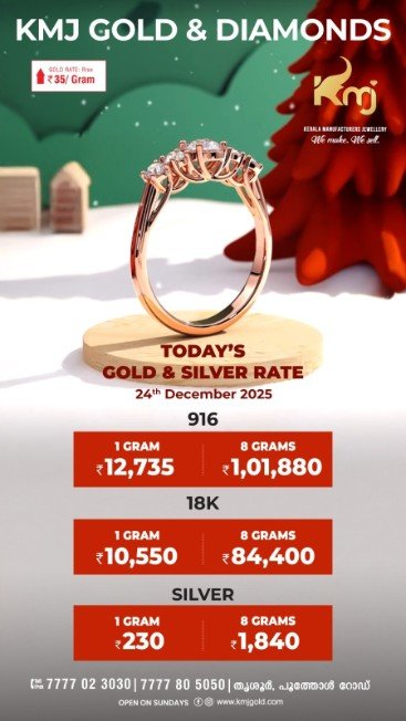 Gold prices in the state continue to surge, breaking records after crossing the ₹1 lakh mark per sovereign. On Wednesday, the price of gold increased by ₹280 per sovereign, taking the rate to ₹1,01,880. The price per gram rose by ₹35 to ₹12,735.