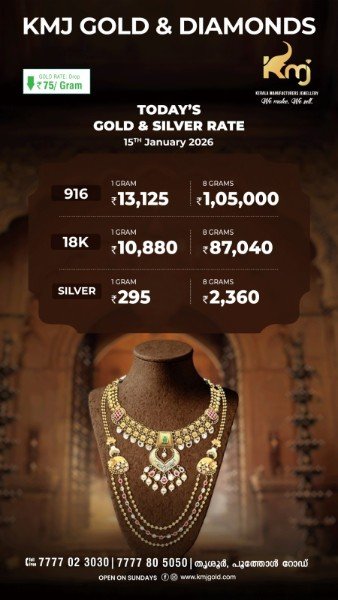 Kochi: After touching historic highs, gold prices in the State witnessed a sharp reversal on Friday, offering brief relief to buyers. The price of gold fell by ₹600 per sovereign, bringing the rate down to ₹1,05,000. On a per-gram basis, prices declined by ₹75, with one gram of gold now costing ₹13,125.
