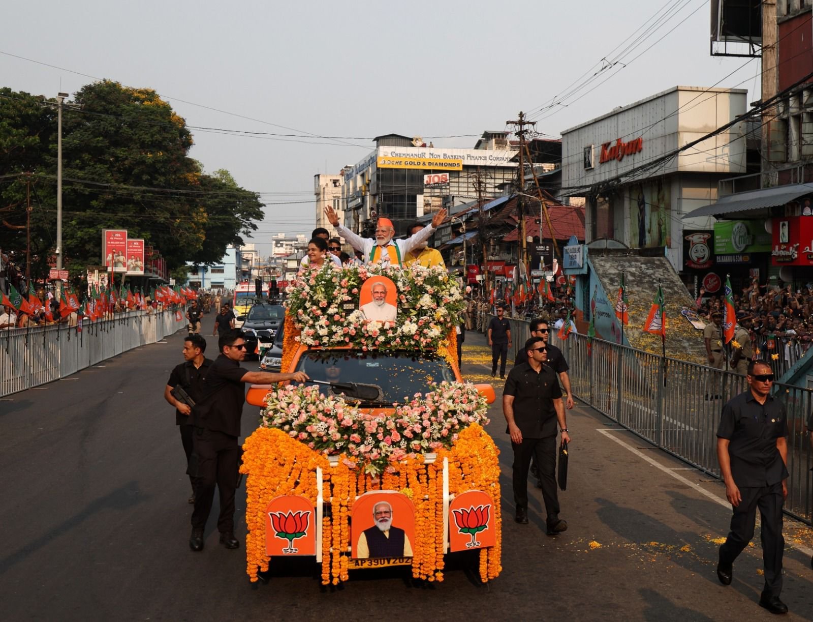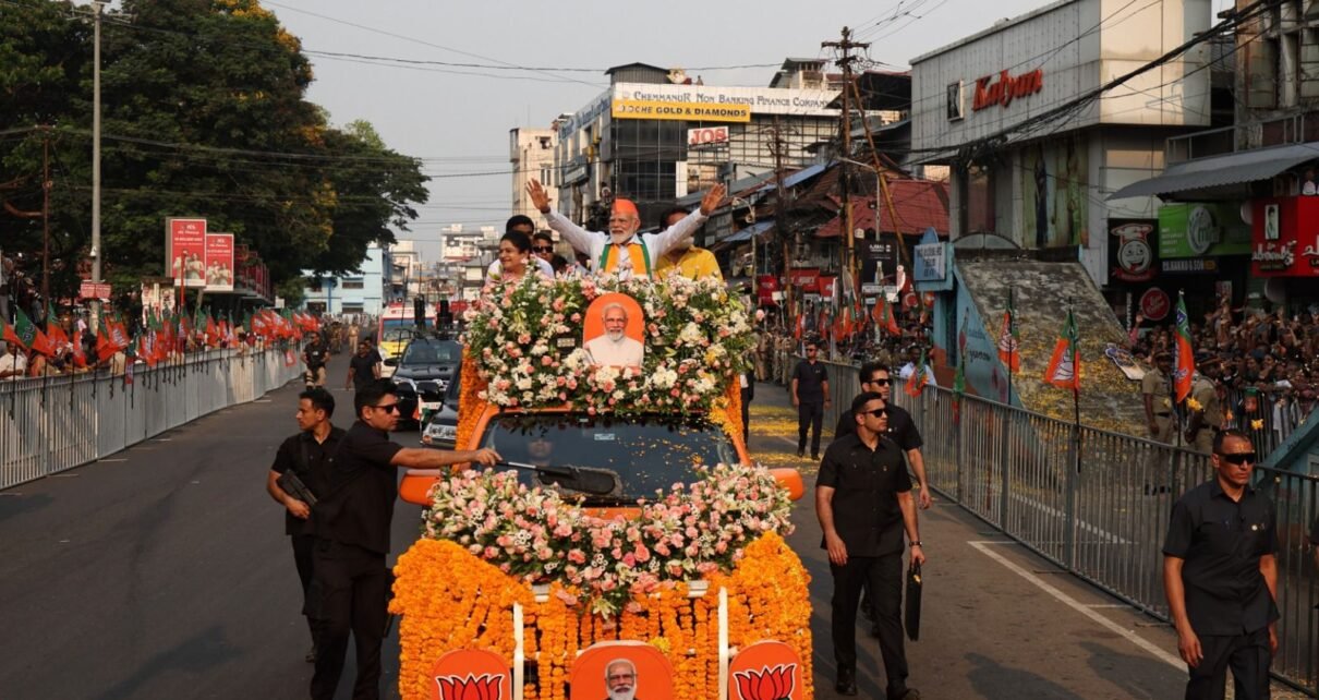 Thrissur: Narendra Modi held a lively roadshow in Thrissur, boosting the NDA’s election campaign in the state.Large crowds gathered along the route, cheering and welcoming the Prime Minister with flowers. Traditional performances added a festive mood to the event.Senior leaders, including Suresh Gopi, joined the roadshow. Party workers said the visit has increased confidence ahead of the upcoming elections.